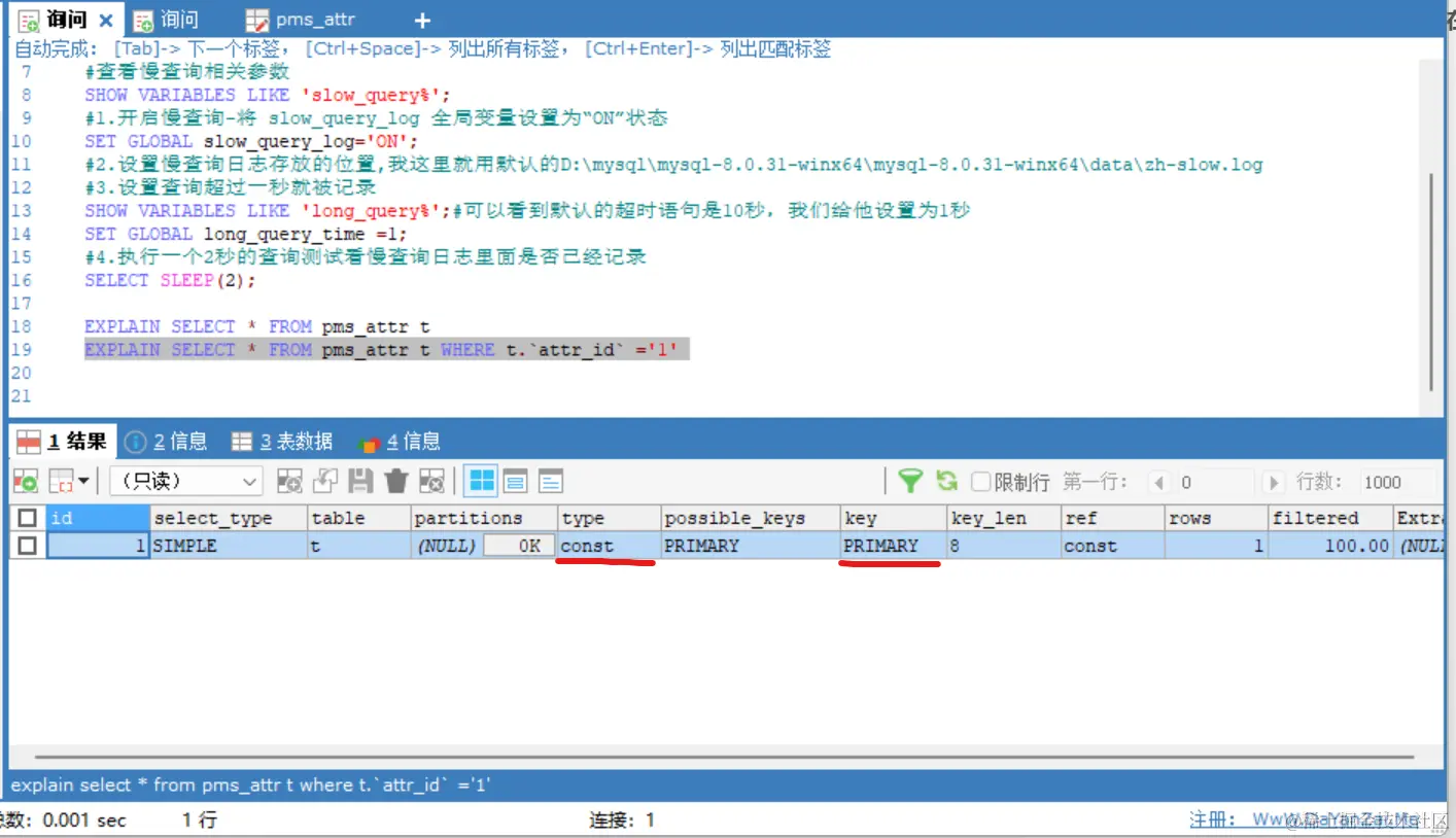 再执行我标黑的这个sql语句,type为const,就是比较合理的。key也可以看到不是null,说明是走了索引的。