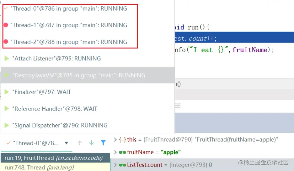 然后启动调试,此时在调试面板中会出现三个线程运行到此处都暂停了,它们都进入了if判断中。