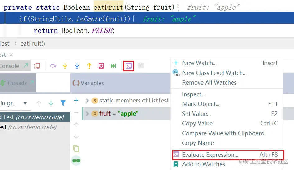 我们可以使用Drop Frame功能,回退对当前方法的调用,回到调用处,再次点击Step Into又能重新进到eatFruit方法中了,俗称后悔药。