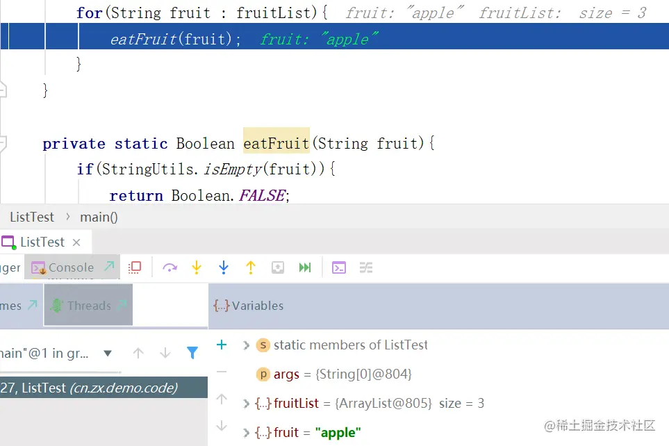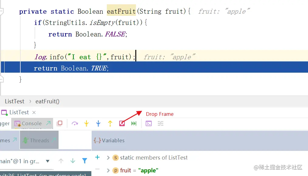 假设在如下的代码中,我们在eatFruit方法中不慎运行到了方法的最后一行,但是此时我们有些疑惑,一开始的if语句为什么判断为false,但是此时已经不能后退到那一行了,我们该停止当前调试重新来过吗?