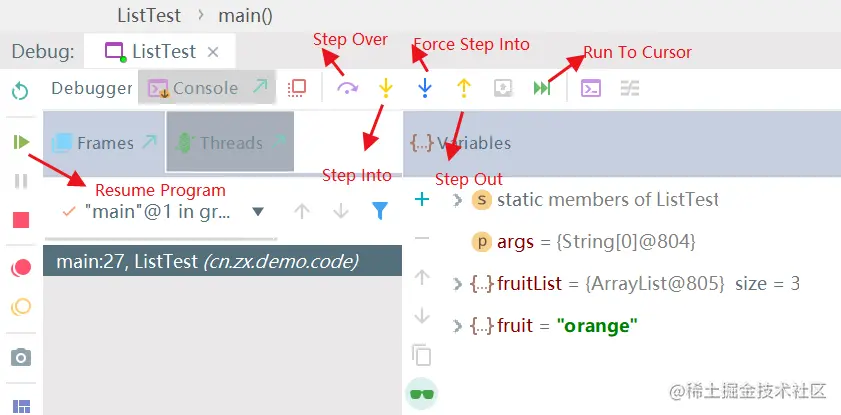 下图是开发过程中在IDEA的调试面板页最常使用的调试功能,下面我们一个个地说下它们代表的含义。