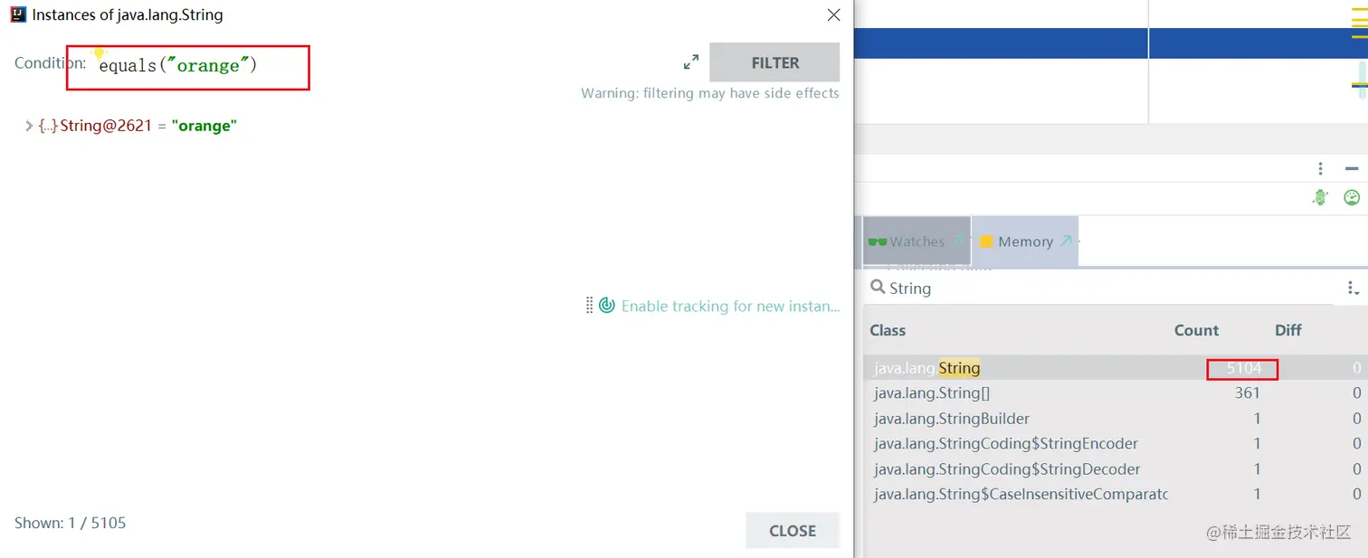 我们想查看当前所有的内存对象可以打开Memeory选项卡,在右下侧过滤所有的对象类型,双击后在弹出框中会展示所有该类型的对象,然后可以通过condition对所有该类型的对象进行筛选