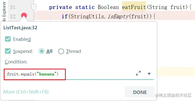 再次启动调试,会发现,前两次迭代都没有在该断点处暂停,只有第三次迭代,当fruit值为banana的时候,断点才有效。