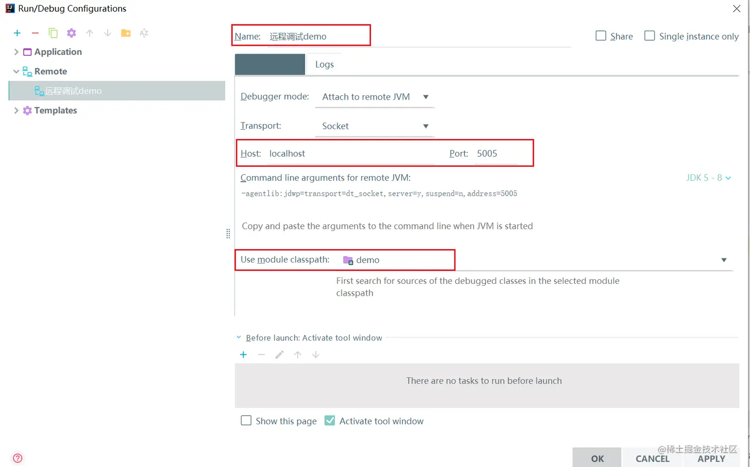 Name可以自己取,host填写正在运行demo.jar的服务器地址,端口号保持和服务器上运行jar时设置的address参数中的端口号保持一致,最后,选择想要使用的代码模块。