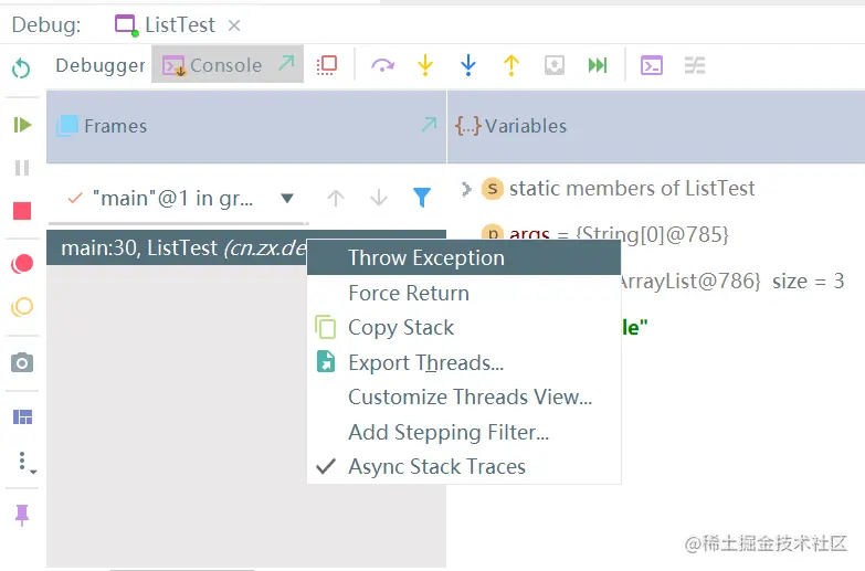 可以在调试界面的左侧选择当前的进程,然后右击,选择Throw Exception,在弹出框内给出具体的想要抛出的异常类型。