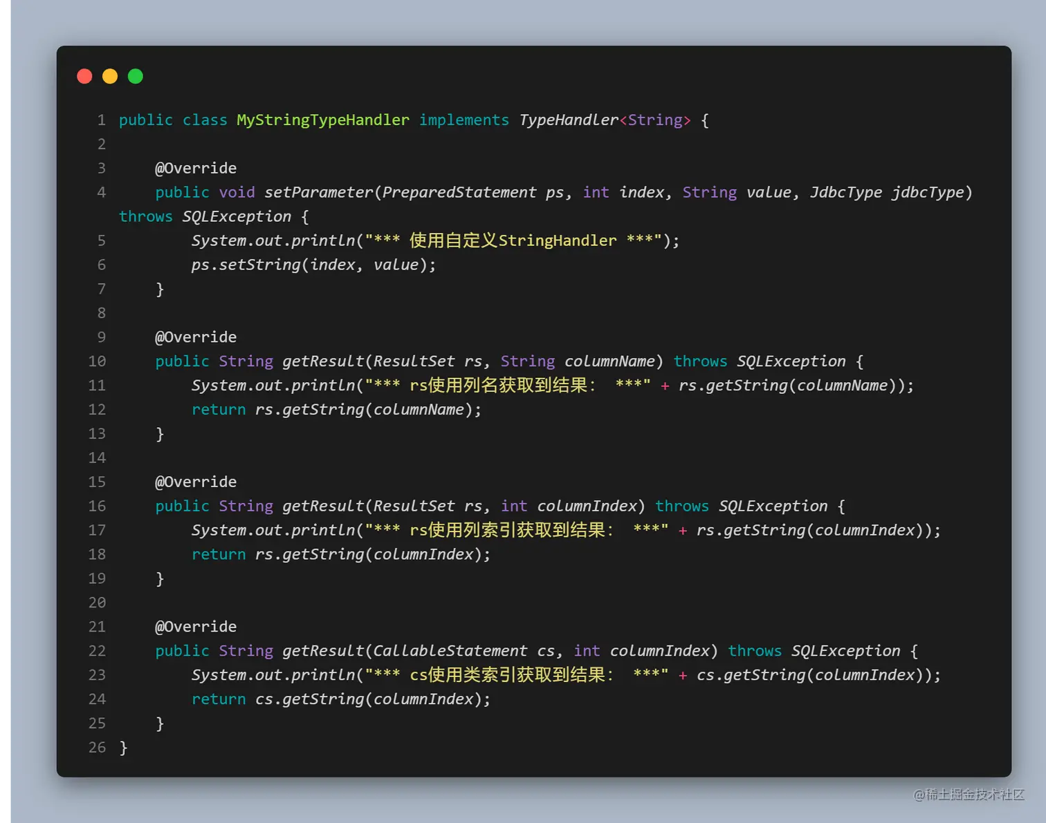 这些是 MyBatis 系统定义的,已经可以适用于大部分场景了,如果遇到无法处理的类型,MyBatis 也支持自定义。我们只需要实现 TypeHandler接口或者继承 BaseTypeHandler类,其中有4个抽象方法,我们也需要实现这四个抽象方法,其中: