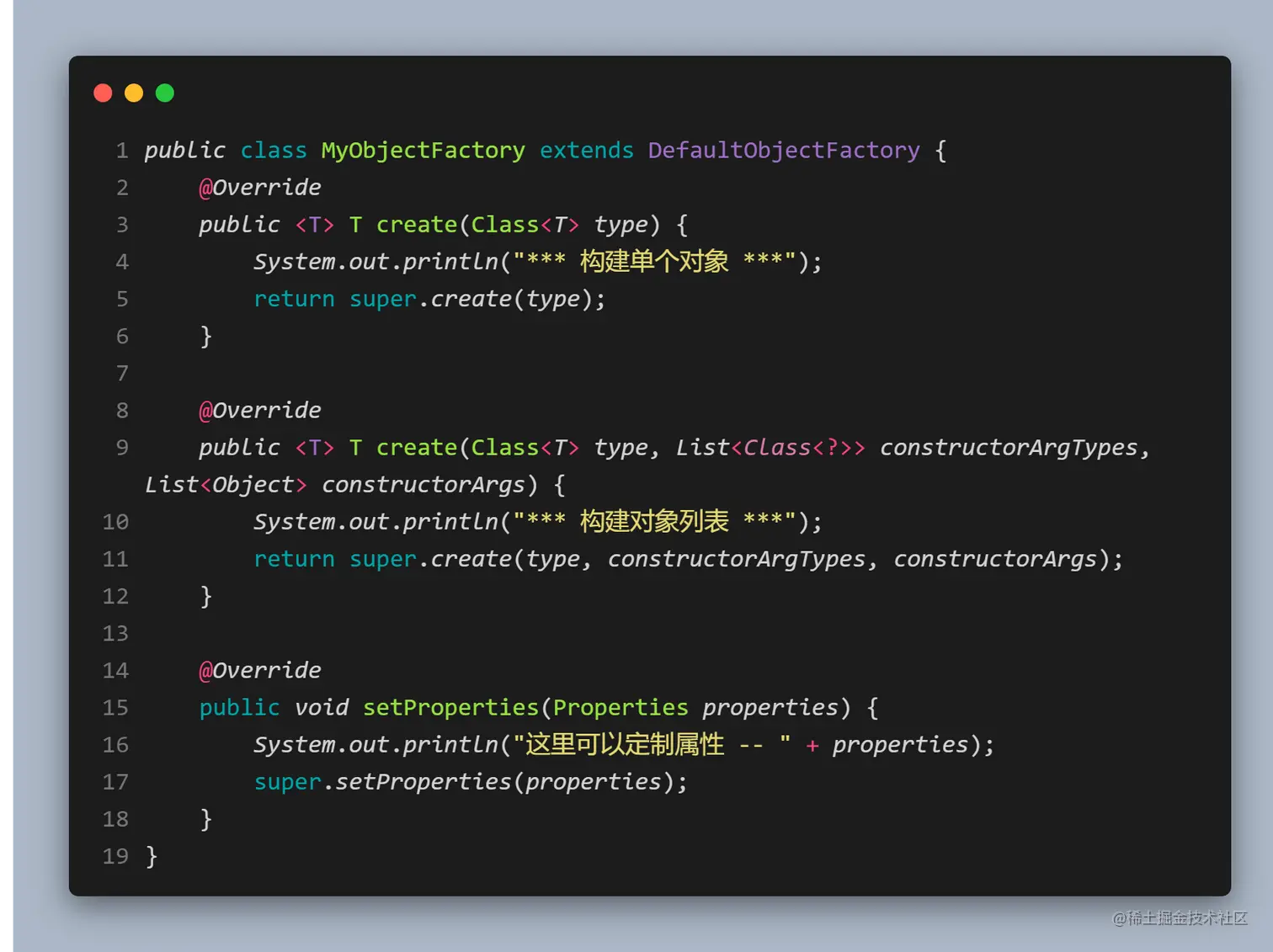 当 MyBatis 构建一个结果集返回的时候,都会用 ObjectFactory(对象工厂)来构建 POJO。因此我们也可以自定义 ObjectFactory 来构建 POJO。例子如下: