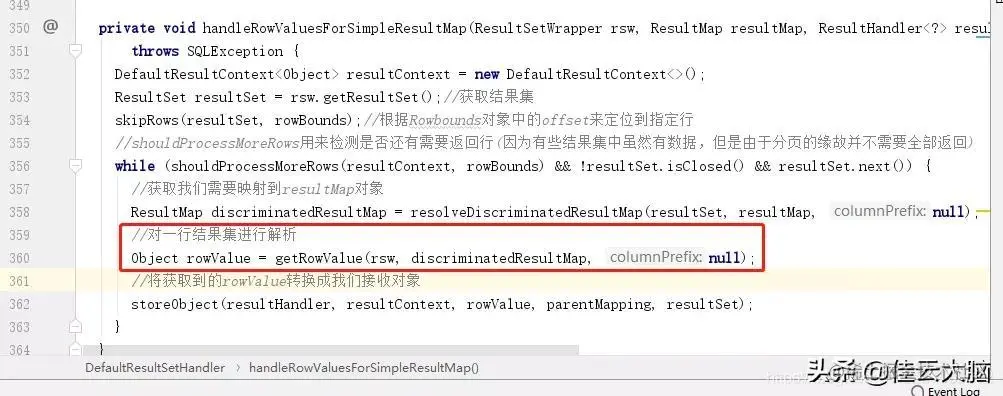 结果集映射里面的逻辑相对来说还是挺复杂的,因为要考虑到非常多的情况,这里我们就不会去深究每一个细节,直接进入到正式解析结果集的代码,下面的5个代码片段就是一个简单的但是完整的解析流程: