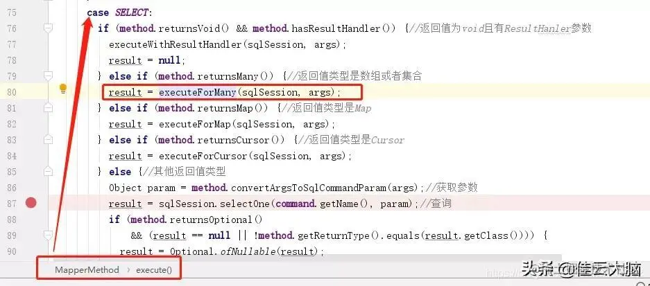 - 2、这里面会根据语句类型以及返回值类型来决定如何执行,本人这里返回的是一个集合,故而我们进入executeForMany方法:
