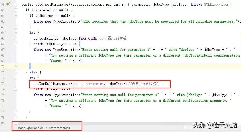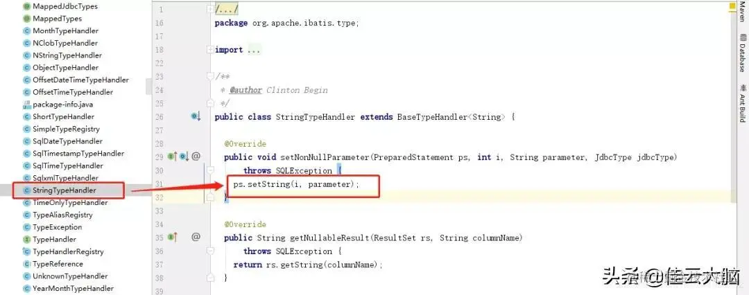 上面的BaseTypeHandler是一个抽象类,setNonNullParameter并没有实现,都是交给子类去实现,而每一个子类就是对应了数据库的一种类型。下图中就是默认的一个子类StringTypeHandler,里面没什么其他逻辑,就是设置参数。