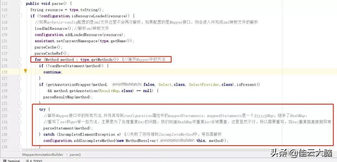所以这个方法里面会去解析@Select等注解,需要注意的是,parse方法里面会同时再解析一次xml映射文件,因为上面我们提到了mappers节点有4种配置方式,其中两种配置的是Mapper接口,而配置Mapper接口会直接先调用addMapper接口,并没有解析映射文件,所以进入注解解析方法parse之中会需要再尝试解析一次XML映射文件。