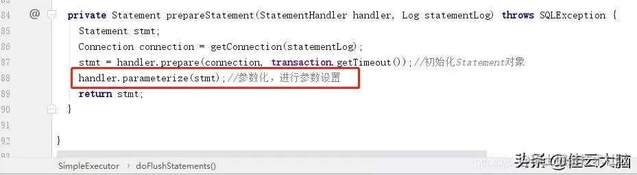 注意,前面我们的sql语句还是占位符的方式,并没有将参数设置进去,所以这里在return上面一行调用prepareStatement方法创建Statement对象的时候会去设置参数,替换占位符。参数如何设置我们先跳过,等把流程执行完了我们在单独分析参数映射和结果集映射。