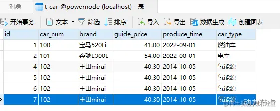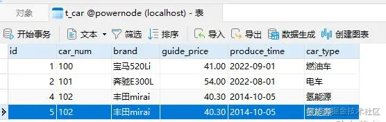 以上程序运行后,看到数据库表t_car中又新增一条数据,如下(成功了):