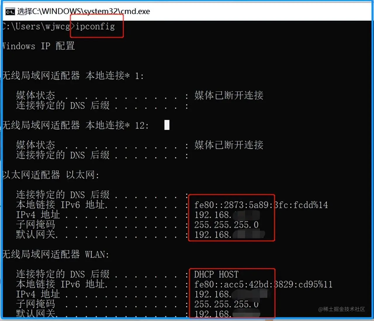 5.当然了还有一种简单的方法找到该电脑的ip地址,就是在cmd命令中输入ipconfig命令,一不就查到了该电脑的ip地址,建议喜欢用命令的小伙伴可以掌握该命令,工作中很实用!如下图所示: