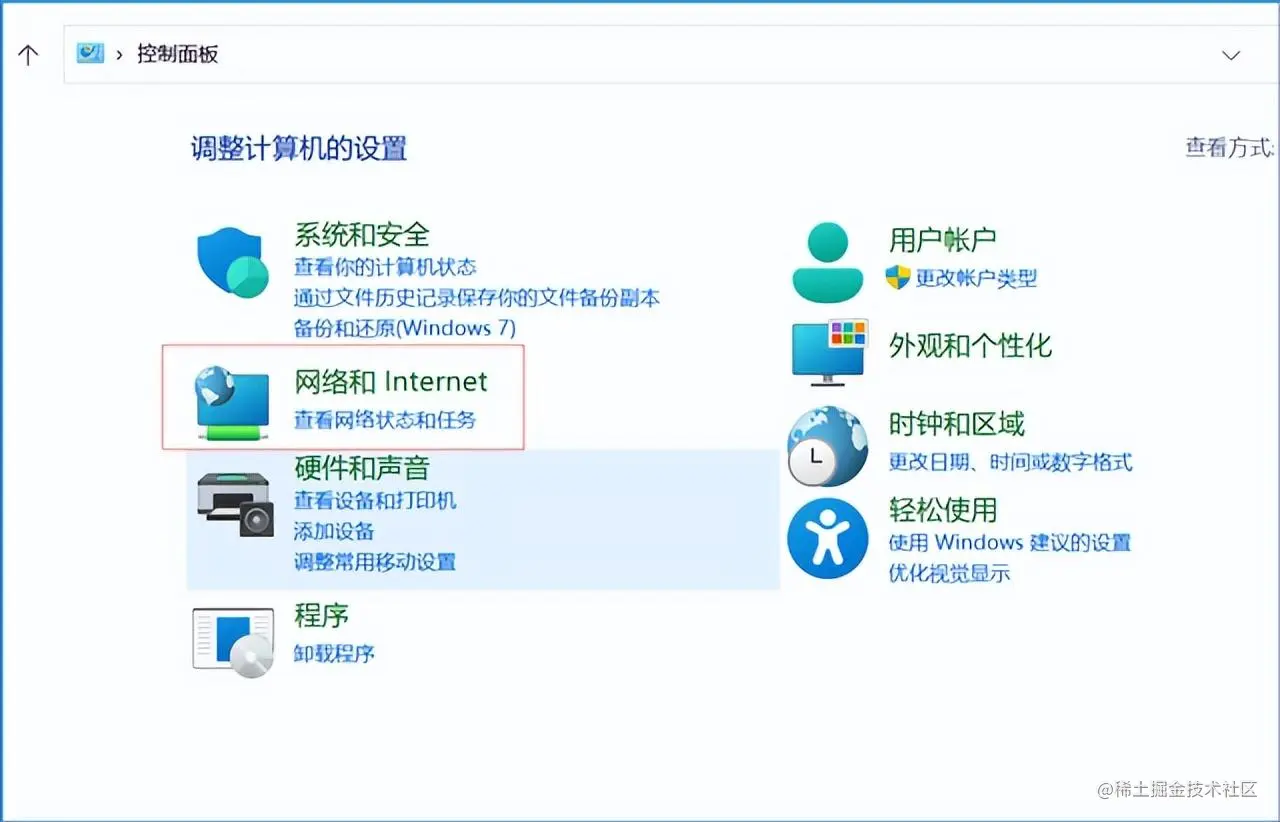 1.我们打开控制面板,找到网络和Internet,如下图所示: