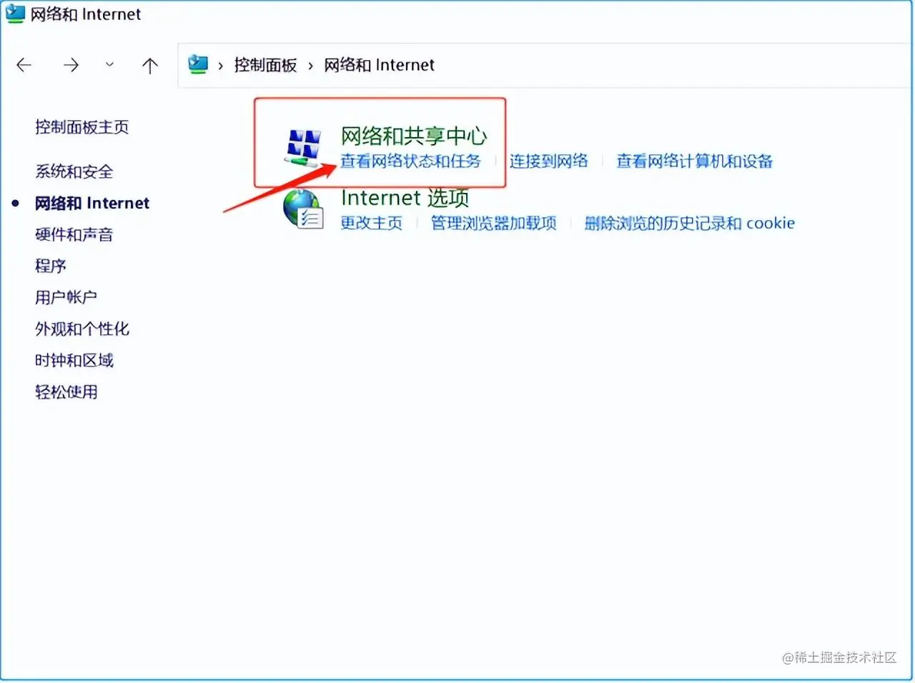 2.我们点开网络和Internet,弹出网络和Internet对话框,点击查看网络状态和任务,如下图所示: