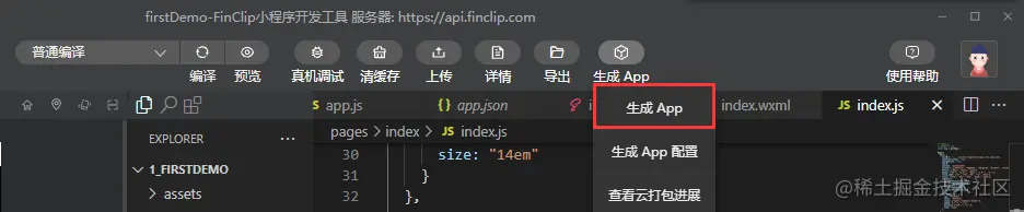 点击IDE的菜单栏生成APP->下一步->本地编译->下一步→选择相应APP ID->下一步->确认配置APP信息->下一步->导出目录->完成->等待导出。