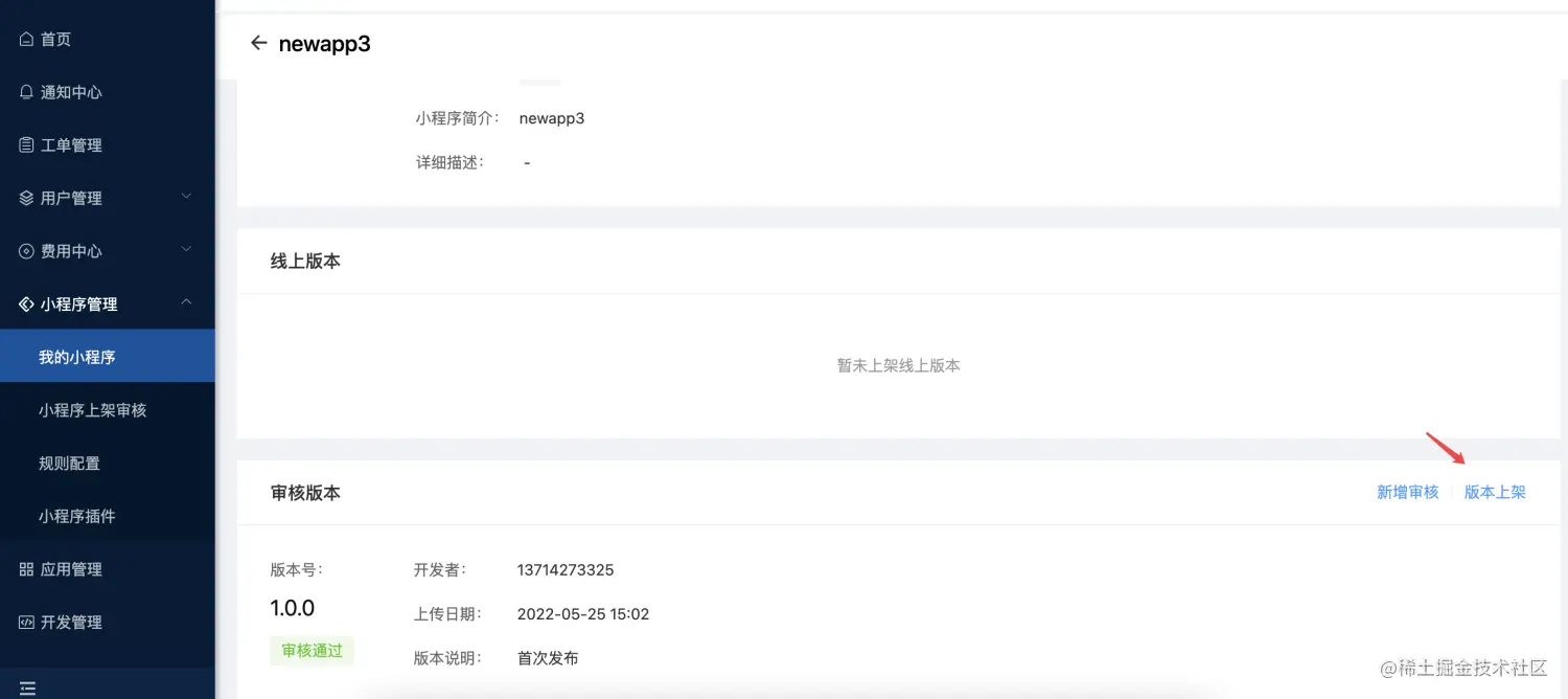 在小程序管理->我的小程序找到newapp3->详情->审核版本->版本上架->确认上架。