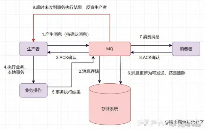 - MQ收到消息后,将消息持久化到存储系统,这条消息的状态是待发送状态。