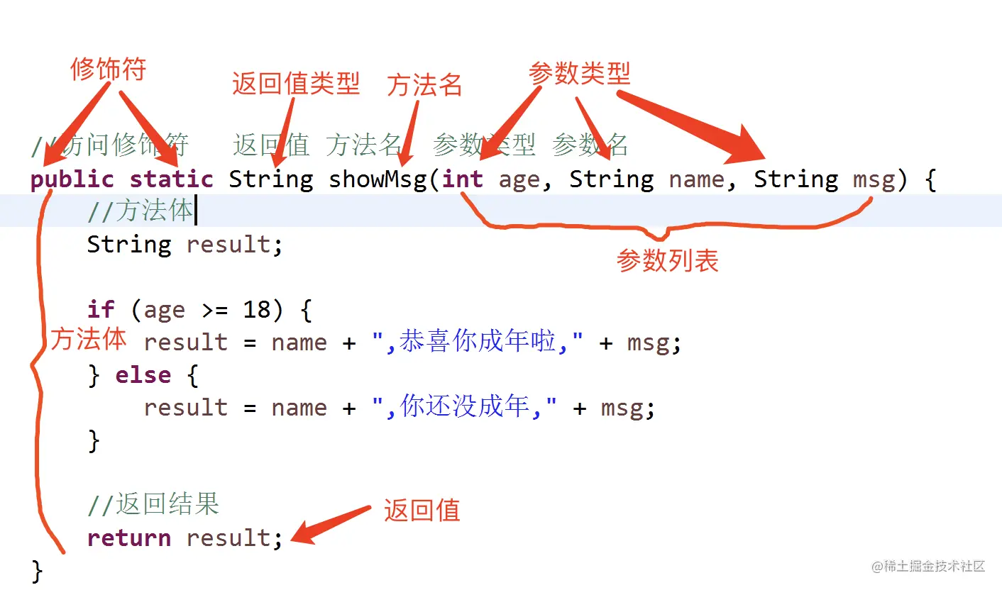 // 访问修饰符 返回值 方法名 参数类型 参数名