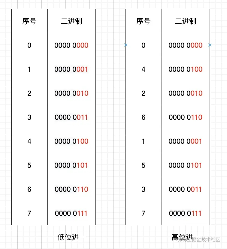 我们将Redis扫描的游标与顺序扫描的游标转换成二进制作对比: