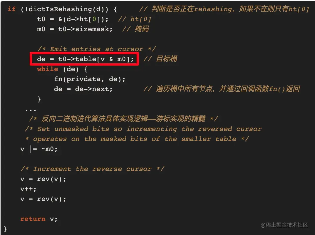 这时字典表已完成缩容,之前6和14号桶的数据已经Rehash到新表的6号桶中,那14号桶都没有了,要怎么处理呢?我们继续在源码中找答案:
