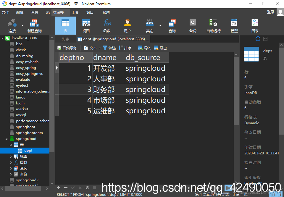 创建部门数据库脚本,数据库名:springcloud