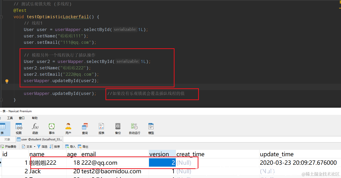 乐观锁:先查询,获得版本号 线程A: update user set name="xxx",version = version+1 where id = 2 and version=1 线程B: (线程抢先完成,这时候 version=2 ,会导致 A 修改失败) update user set name="xxx",version = version+1 where id = 2 and version=1