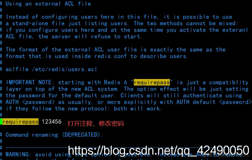 requirepass 默认是注释状态,打开注释,设置密码,我设的是123456 (也可以不设置)