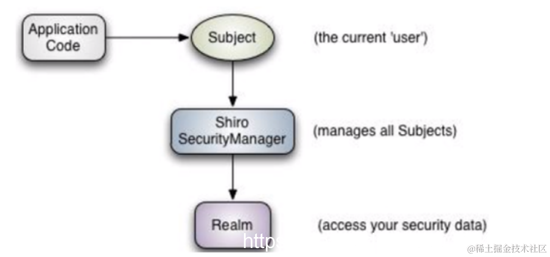 - subject: 应用代码直接交互的对象是Subject,也就是说Shiro的对外API核心就是Subject, Subject代表了当前的用户,这个用户不一定是一个具体的人,与当前应用交互的任何东西都是 Subject,如网络爬虫,机器人等,与Subject的所有交互都会委托给SecurityManager;Subject其 实是一个门面,SecurityManageer 才是实际的执行者