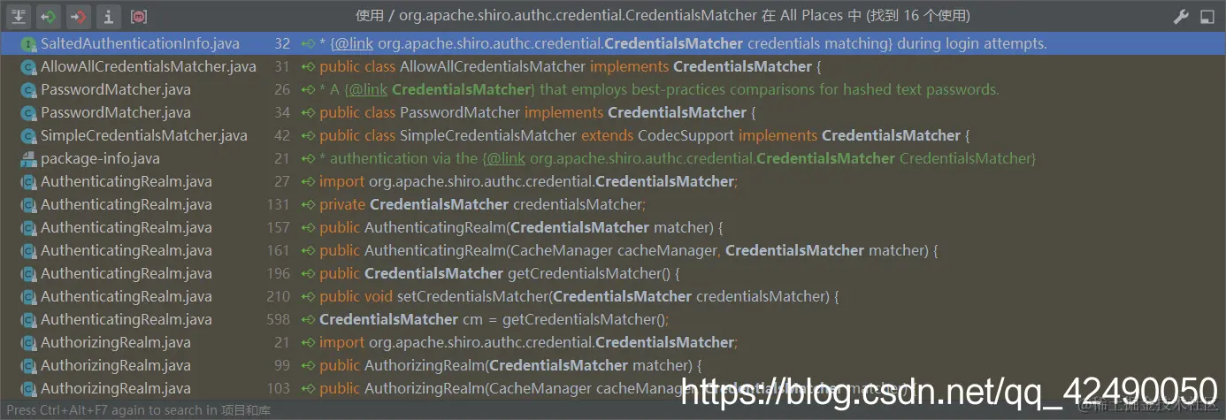 我们可以去 realm 的父类 AuthorizingRealm 的父类 AuthenticatingRealm 中找一个方法 核心: getCredentialsMatcher() 翻译过来:获取证书匹配器