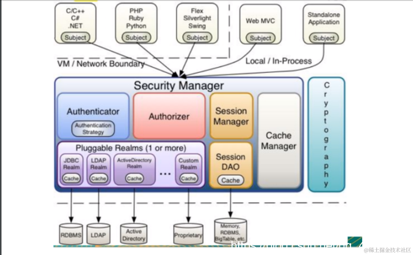 - Authenticator: 负责Subject认证,是一个扩展点,可以自定义实现;可以使用认证策略 (Authentication Strategy),即什么情况下算用户认证通过了;