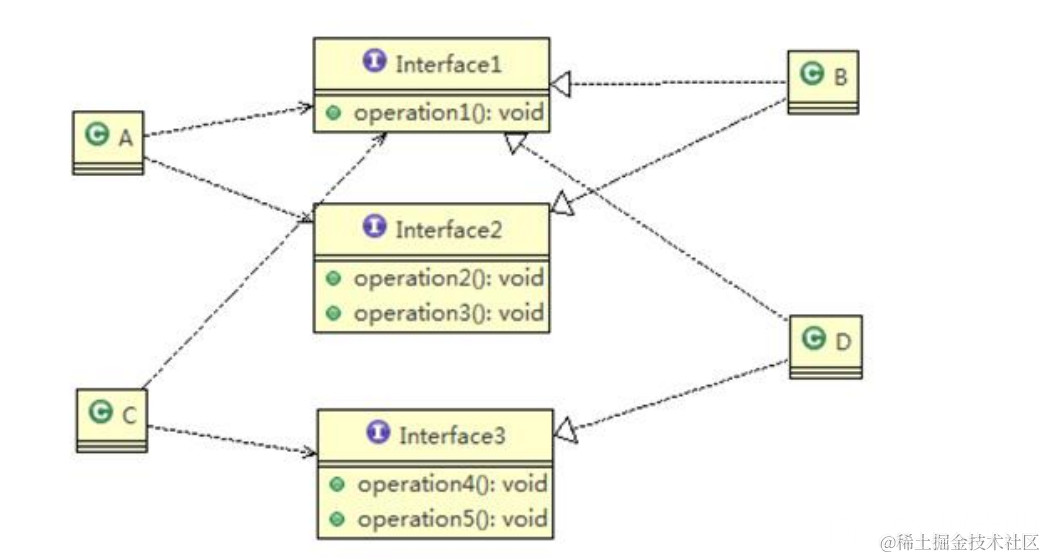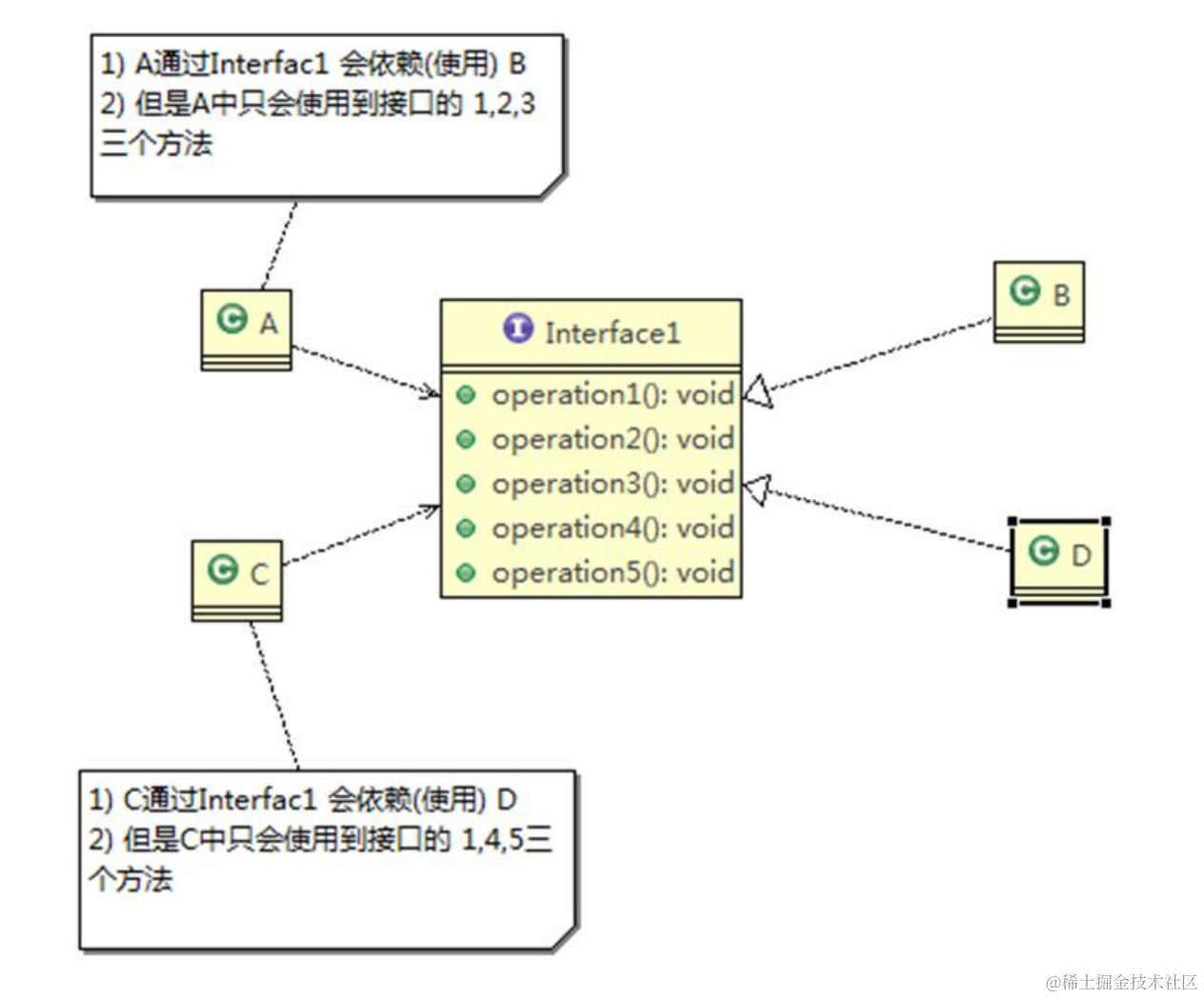- 类 A 通过接口 Interface1 依赖类 B,类 C 通过接口 Interface1 依赖类 D,如果接口 Interface1 对于类 A 和类 C 来说不是最小接口,那么类 B 和类 D 必须去实现他们不需要的方法。