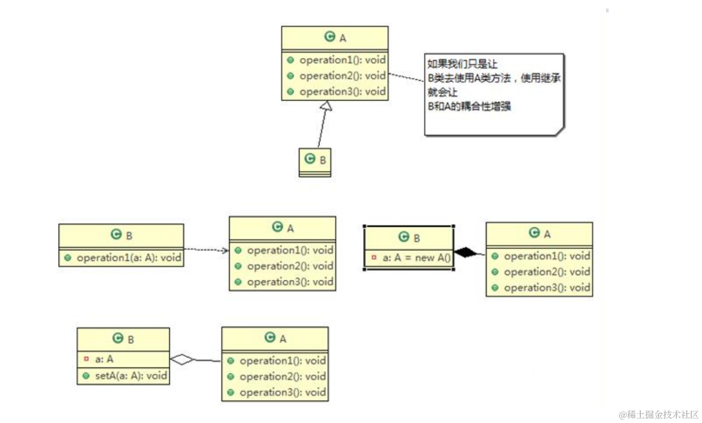 - 直接的朋友: 每个对象都会与其他对象有耦合关系,只要两个对象之间有耦合关系,我们就说这两个对象之间 是朋友关系。耦合的方式很多,依赖,关联,组合,聚合等。其中,我们称出现成员变量,方法参数,方法返回值中的类为直接的朋友,而出现在局部变量中的类不是直接的朋友。也就是说,陌生的类最好不要以局部变 量的形式出现在类的内部