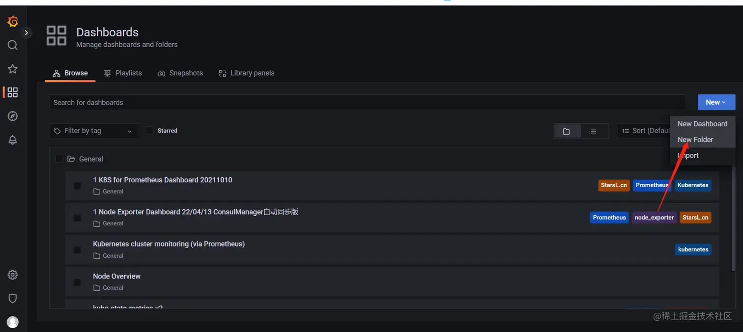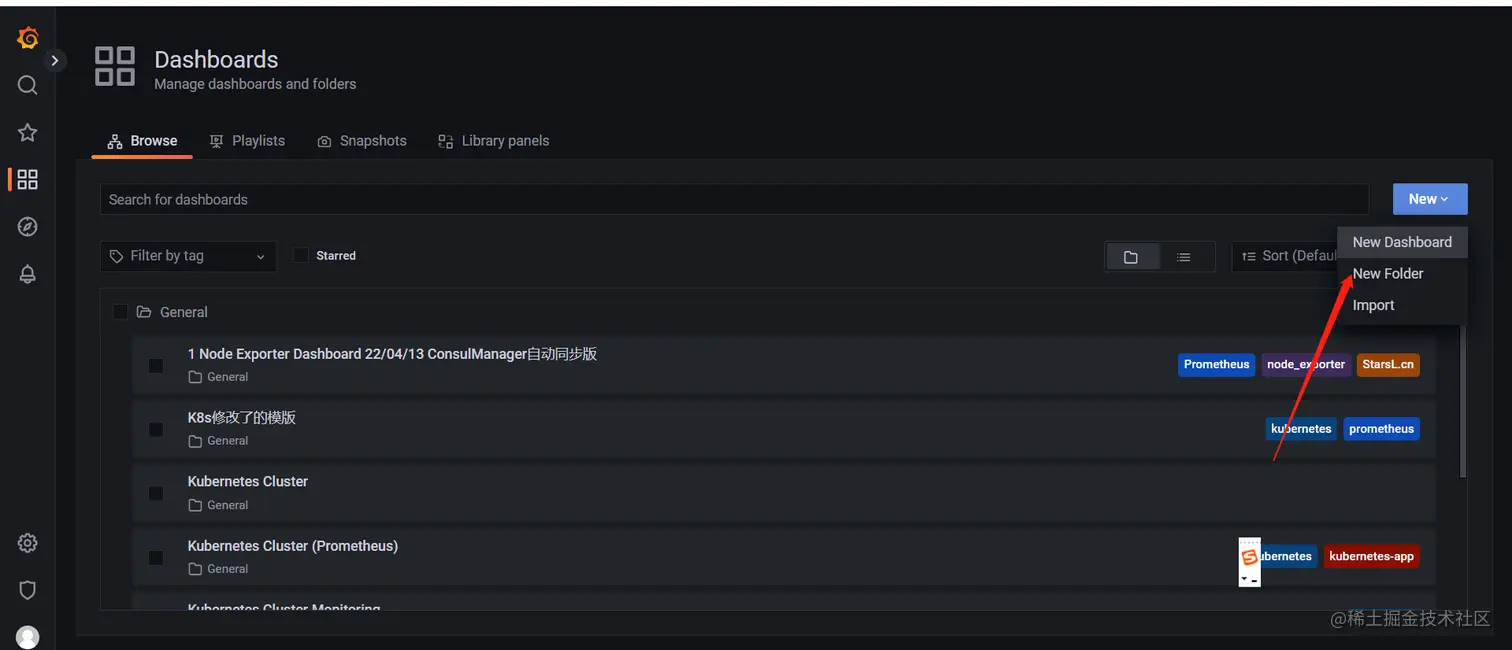dashboard必须属于某个文件夹,可以理解成分类,当dashboard多了之后方便管理,默认的folder是 general,我们可以根据实际情况进行分文件夹,比如 MySQL,K8s等待。