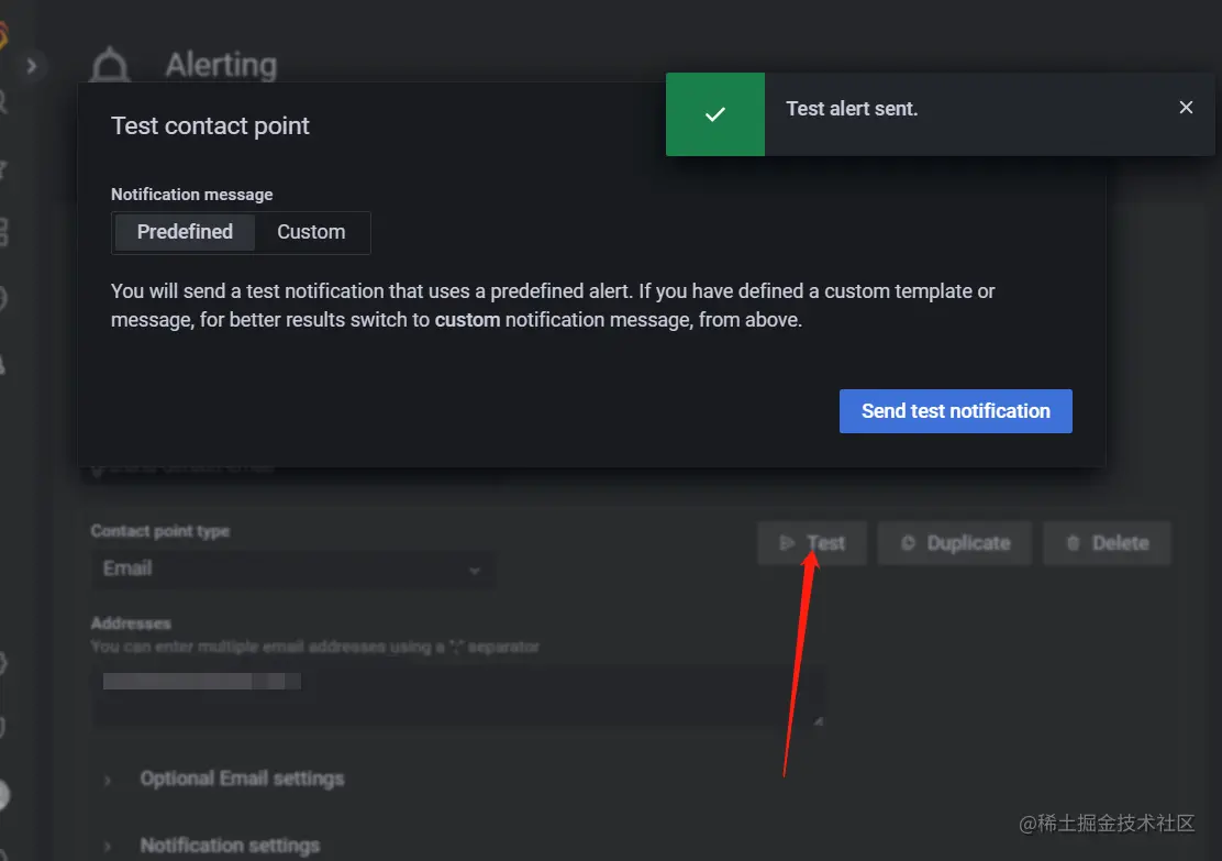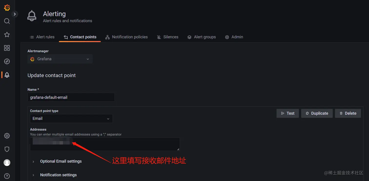 使用告警通道来定义当警报触发时如何通知您的联系人。一个告警通道可以有一个或多个告警通道类型,例如电子邮件、webhook、钉钉、企业微信 等。触发警报时,会向为某个告警通道列出的所有告警通道类型发送通知。或者,使用消息模板自定义告警通道类型的通知消息。您可以配置 Grafana 管理的联系点以及外部 Alertmanager 数据源的联系点。这里不讲,关于对接外部的Alertmanager,请查看官方文档。