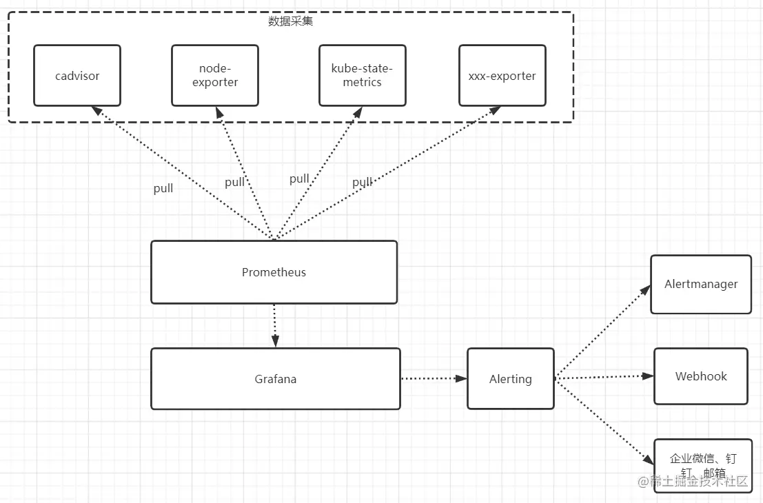 - 通过etcd、kubelet、kube-apiserver、kube-controller-manager、kube-scheduler自身暴露的/metrics获取节点上与k8s集群相关的一些特征指标数据。