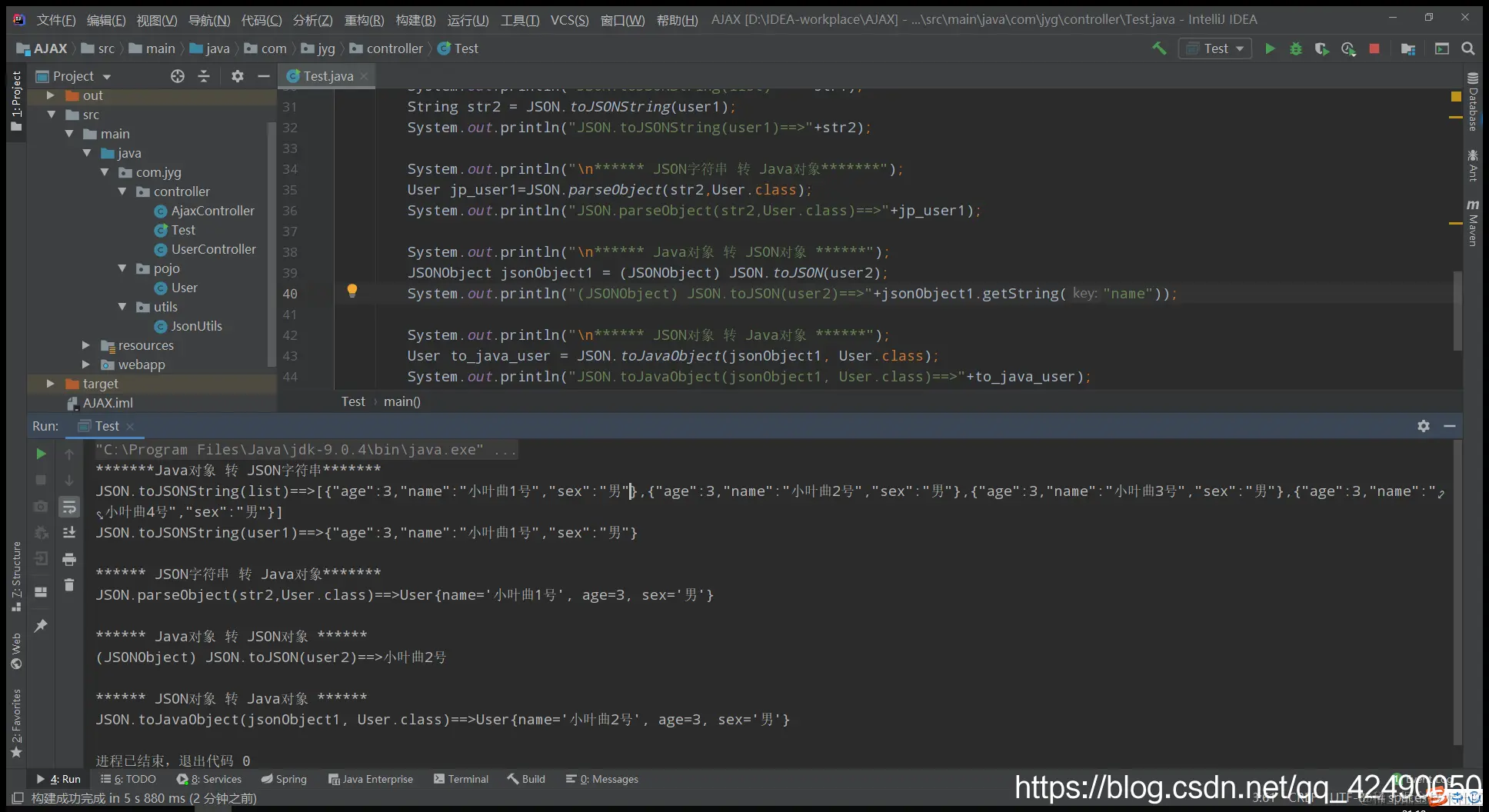 - 仔细观察这些方法,主要是实现json对象,json对象数组,javabean对象,json字符串之间的相互转化。