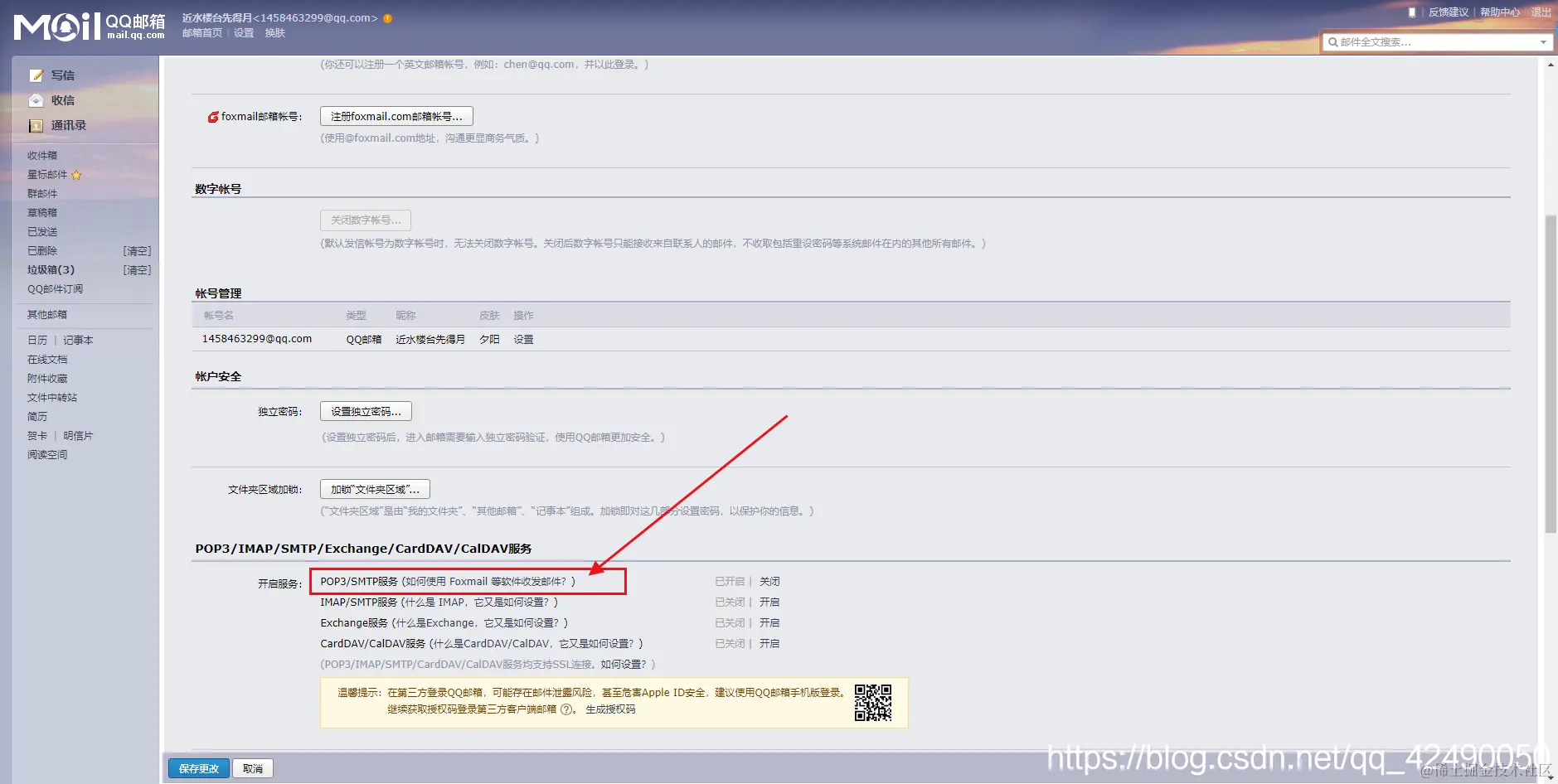 获取授权码:在QQ邮箱中的设置->账户->开启pop3和smtp服务