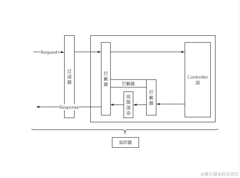 - 拦截器 Interceptor 依赖于框架容器,基于反射机制,只过滤请求;