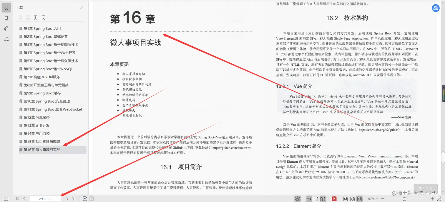 第16章微人事项目实战, 本章向读者介绍了一个微人事项目,主要从登录模块、动态加载用户菜单、员工资料模块、邮件发送模块、Excel导入导出模块、在线聊天模块以及编译打包几个方面介绍。由于原项目代码量庞大,本章主要选取一些关键步骤进行介绍,完整代码读者可以在GitHub上下载,下载地址为。。。。