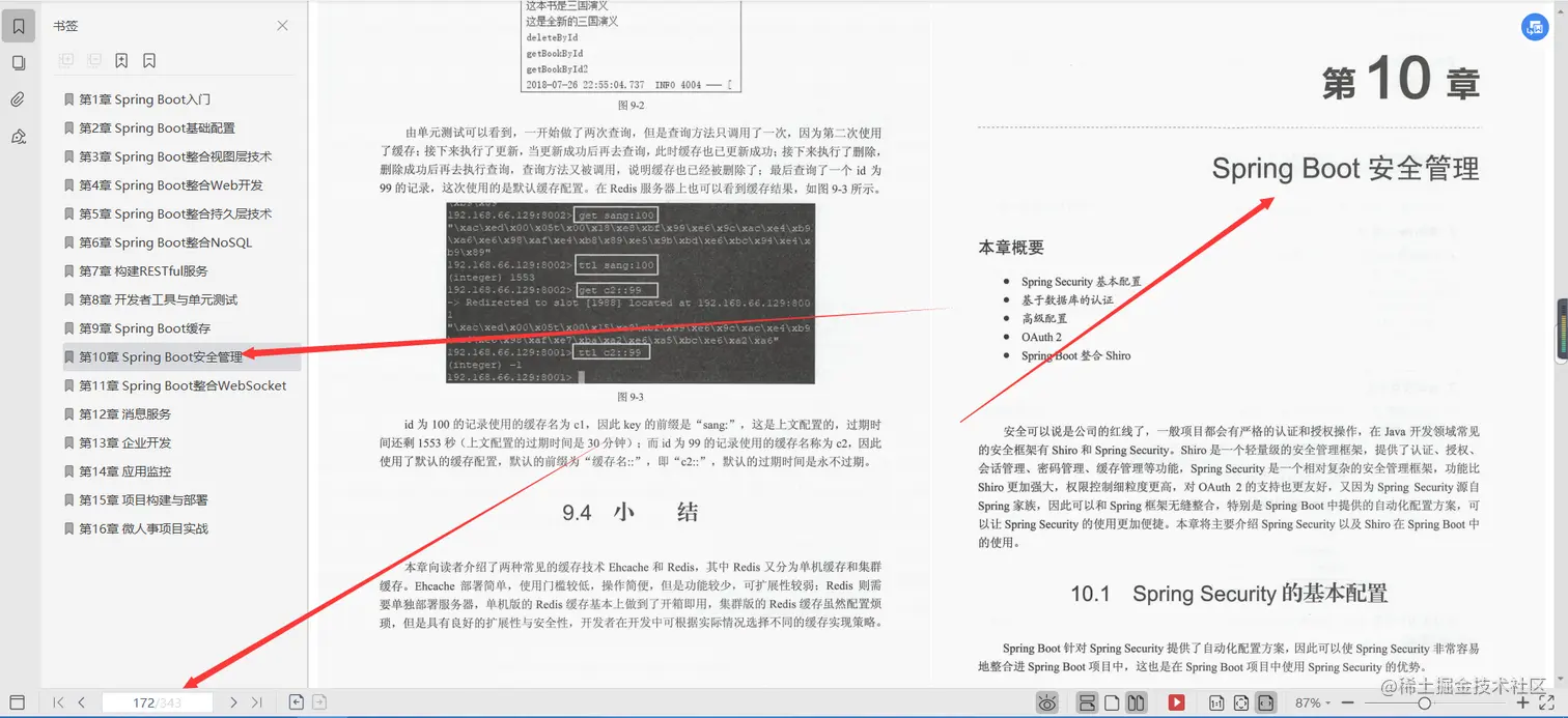 第9章Spring Boot缓存, 本章向读者介绍了两种常见的缓存技术Ehcache和Redis,其中 Redis又分为单机缓存和集群缓存。Ehcache部署简单,使用门槛较低,操作简便,但是功能较少,可扩展性较弱;Redis则需要单独部署服务器,单机版的Redis缓存基本上做到了开箱即用,集群版的Redis缓存虽然配置烦琐,但是具有良好的扩展性与安全性,开发者在开发中可根据实际情况选择不同的缓存实现策略。