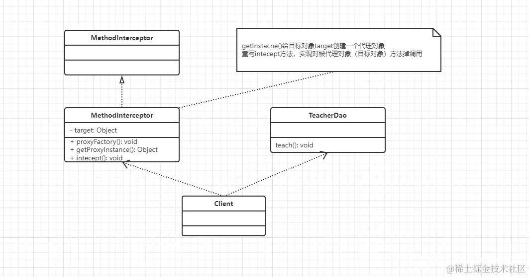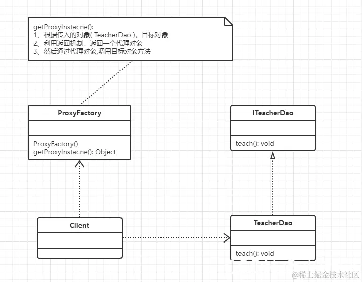 TeacherDao proxyInstance = (TeacherDao)new ProxyFactory(target).getProxyInstance();