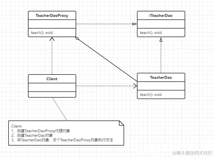 - 使用静态代理方式,就需要在代理对象 TeacherDAOProxy 中也实现 ITeacherDAO