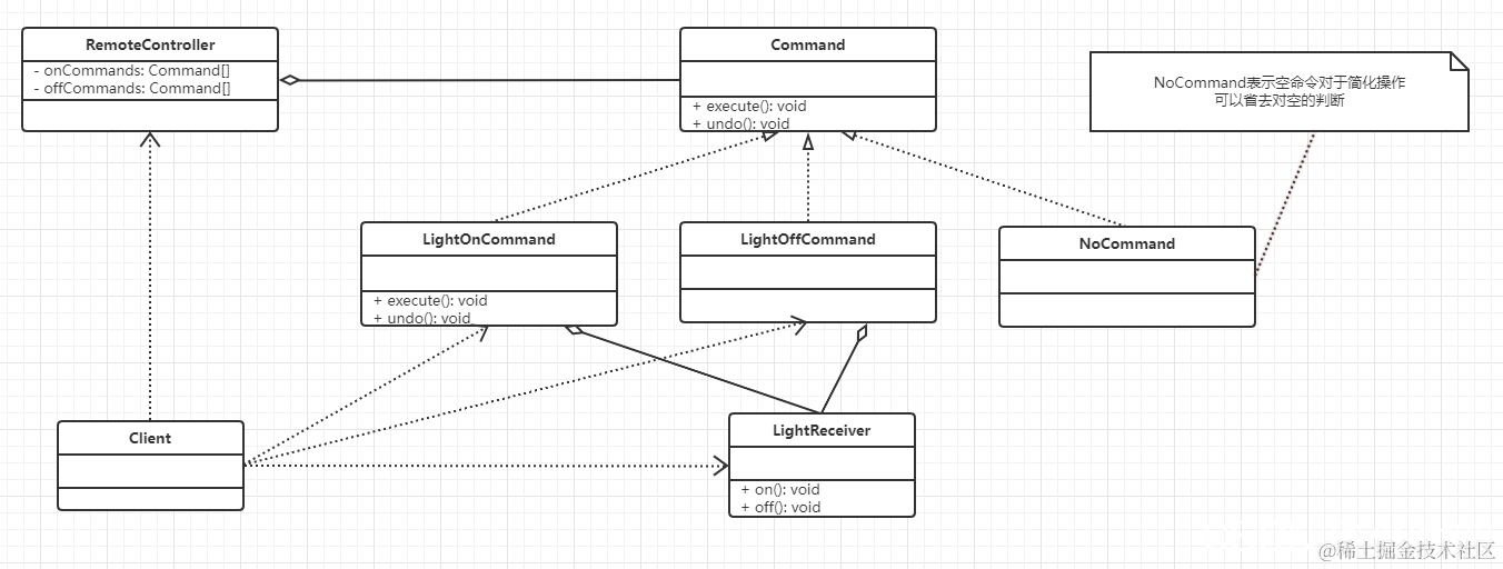 - 空命令也是一种设计模式,它为我们省去了判空的操作。在上面的实例中,如果没有用空命令,我们每按下一 个按键都要判空,这给我们编码带来一定的麻烦。