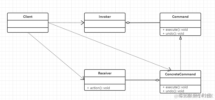 - ConcreteCommand: 将一个接受者对象与一个动作绑定,调用接受者相应的操作,实现 execute