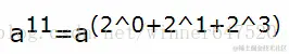 其中要理解base*=base这一步:因为 base*base==base2,下一步再乘,就是base2*base2==base4,然后同理 base4*base4=base8,由此可以做到base-->base2-->base4-->base8-->base16-->base32.......指数正是 2^i ,再看上面的例子,a¹¹= a1*a2*a8,这三项就可以完美解决了,快速幂就是这样。