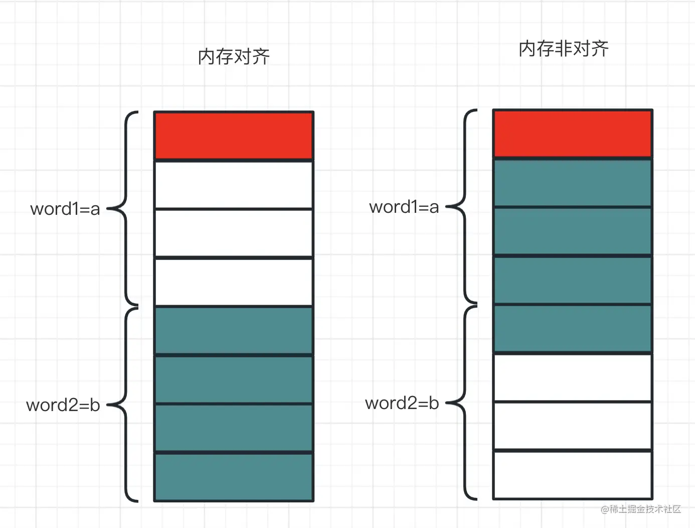 我们假设CPU以4字节为单位读取内存。如果变量在内存中的布局按4字节对齐,那么读取a变量只需要读取一次内存,即word1;读取b变量也只需要读取一次内存,即word2。