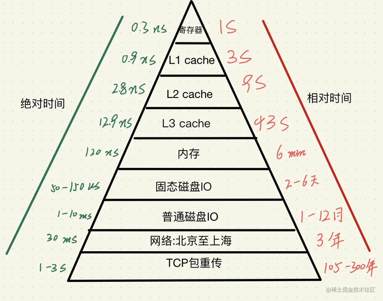 你看!虽然在宏观世界里光速非常快,但是到计算机世界里,光速并没有像我们认知中的那么快。所以即使元件离 CPU 的距离稍微远了一点,运行速度也会下降得非常明显。