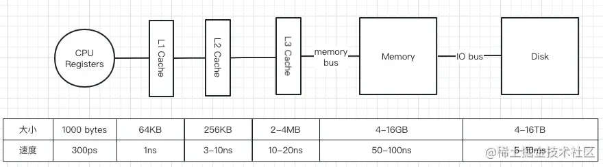L1 cache 在 CPU 中,相比寄存器,虽然它的位置距离 CPU 核心远,但造价更低。通常 L1 cache 大小在几十 Kb 到几百 Kb 不等,读写速度在 2~4 个 CPU 时钟周期。